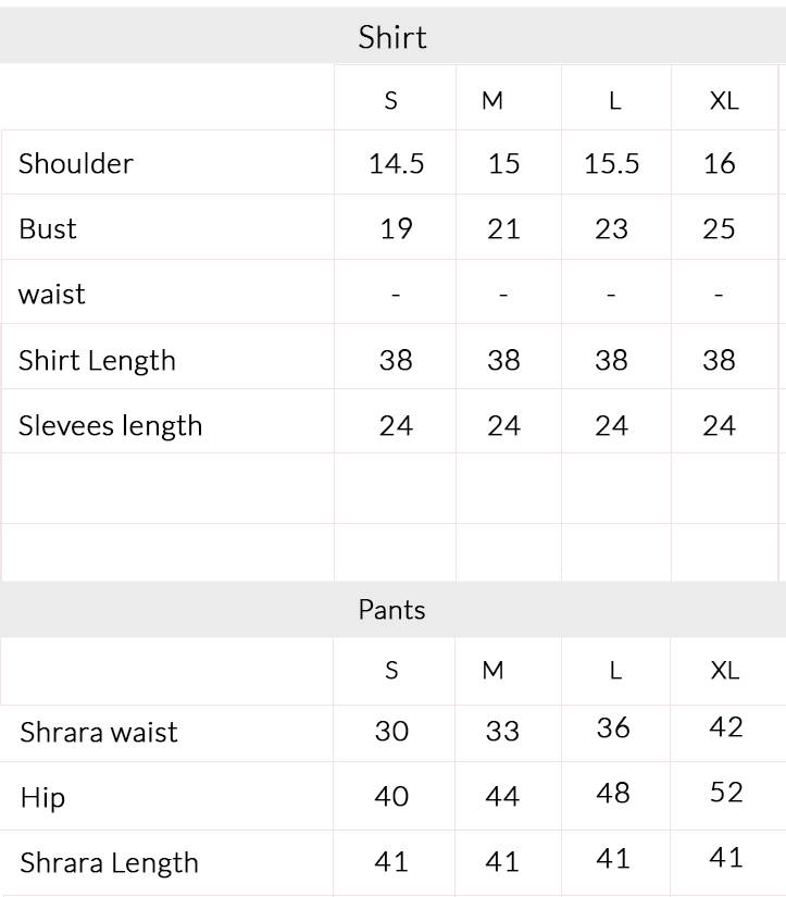Husna is a white and sand-hued signature MNR peplum shirt and sharara ensemble. The peplum shirt is made of delicate paper silk which block printed in traditional leafy motifs and the neckline made in classic Mughal style featuring multi-head embroidery and hand embellishments outlining the contours decorating the whole shirt. It is paired with a sharara also made of coordinating paper silk fabric featuring matching blockprinted motifs and it is liberally adorned with decorative trims along the borders giving it a beautiful feel. The ensemble is completed with a khaadi net dupatta with scalloped edge cutwork and delicate embroidery making it perfect for summer festivities