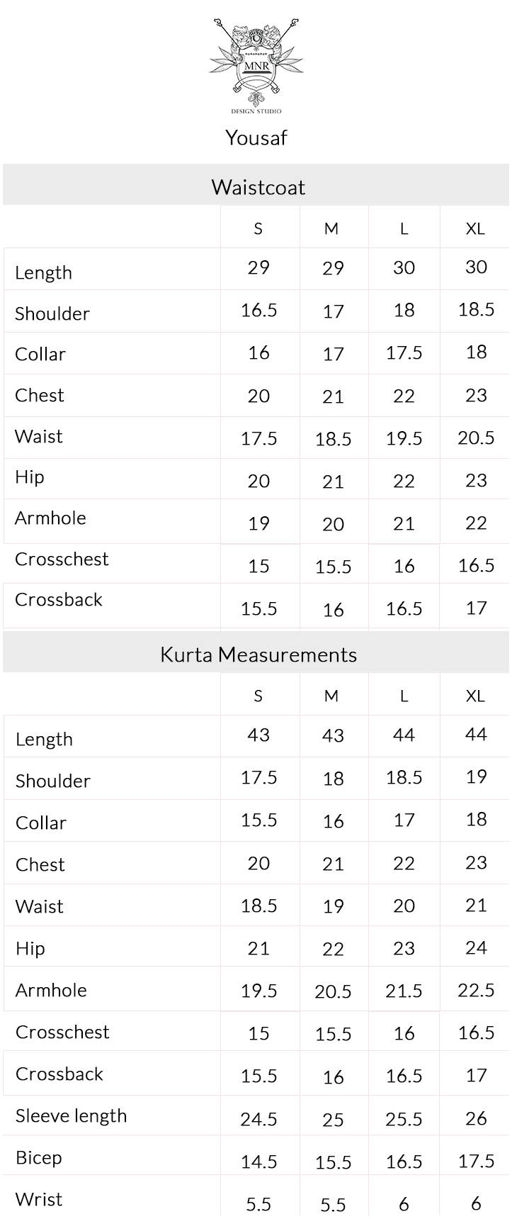 "Yousaf" our signatur MNR ensemble is a harmonious blend of youthful charm and refinement. The lilac-hued karandi waistcoat, embellished with exquisite Mughal paisley boteh and delicate borders of floral vines, exudes a princely aura. Paired effortlessly with a karandi kurta featuring intricate embroidery on the sleeves and plain pajama, this ensemble embodies the essence of festive celebrations. The waistcoat draped over the kurta and pajama creates the perfect fusion of grace and style, an ideal choice for those special occasions where elegance takes center stage.