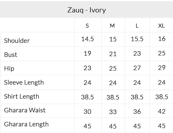 Zauq, An ivory cambric printed shirt, beautifully finished with refined trims and an elegant border, enhanced with delicate adda work for a handcrafted touch. It is paired with a flowing chiffon gharara, detailed with graceful trims that add movement and charm. The ensemble is completed with a single chaan dupatta, lending a subtle festive glow to this timeless and sophisticated look.